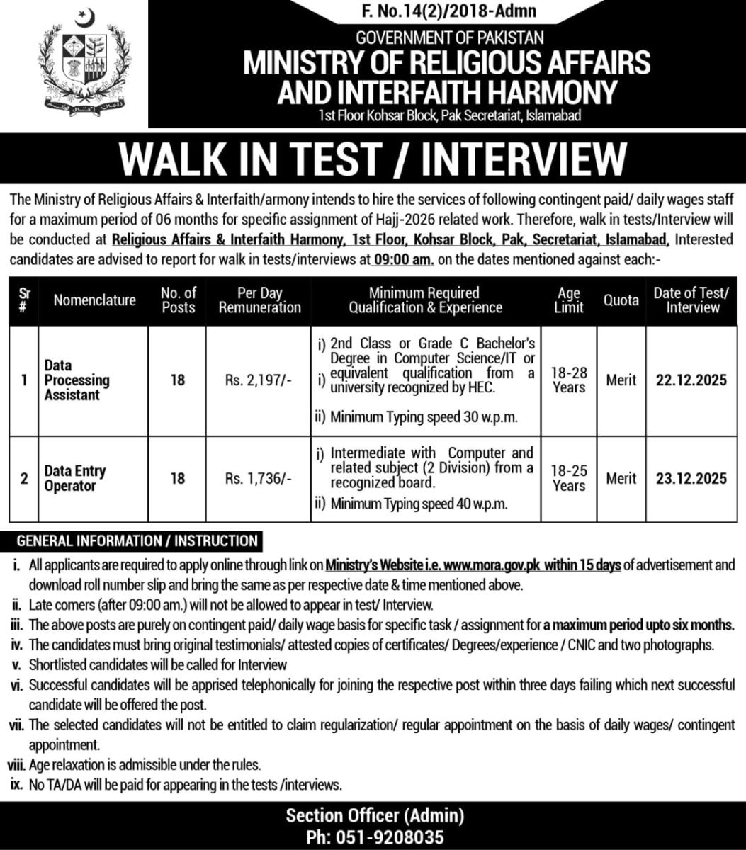 Walk in Test / Interview for the post of DPA and DEO during Hajj Season 2026