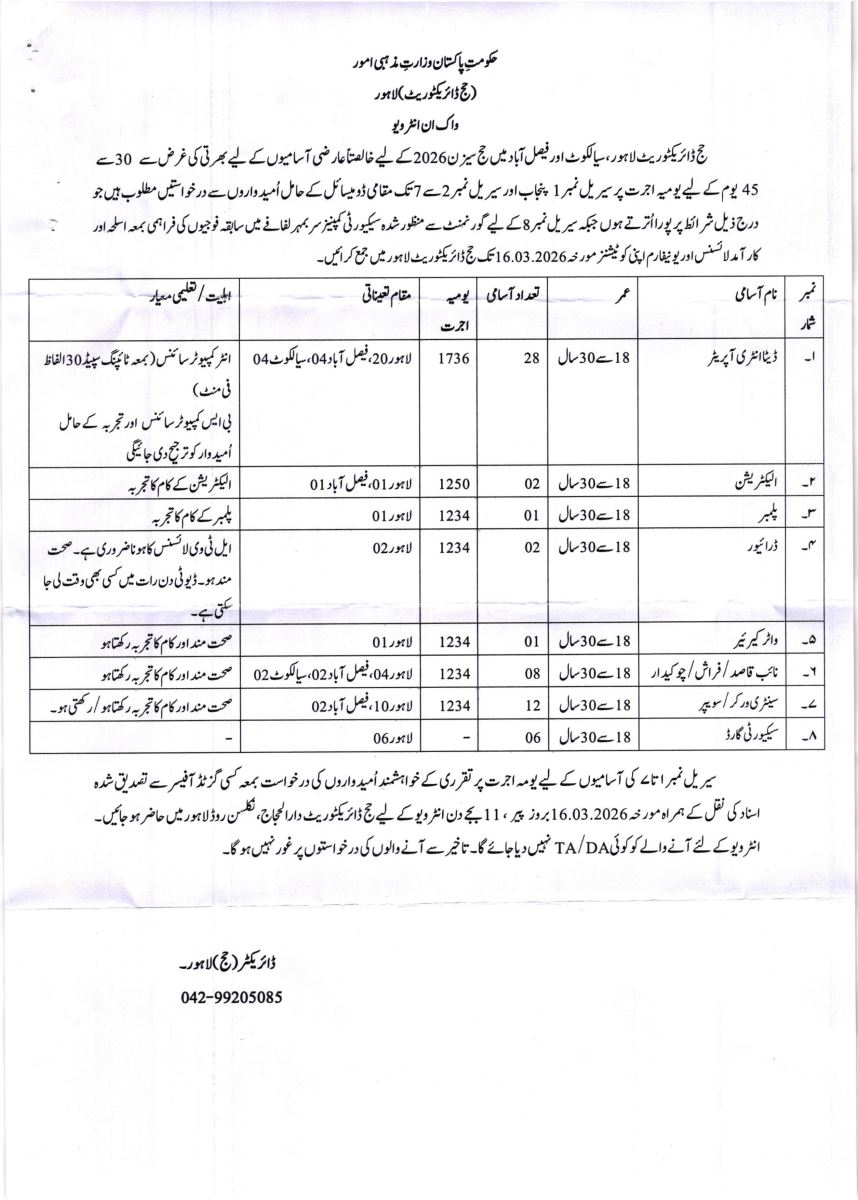Seasonal Vacancies Directorate of Hajj, Lahore, Faisalabad and Sialkot
