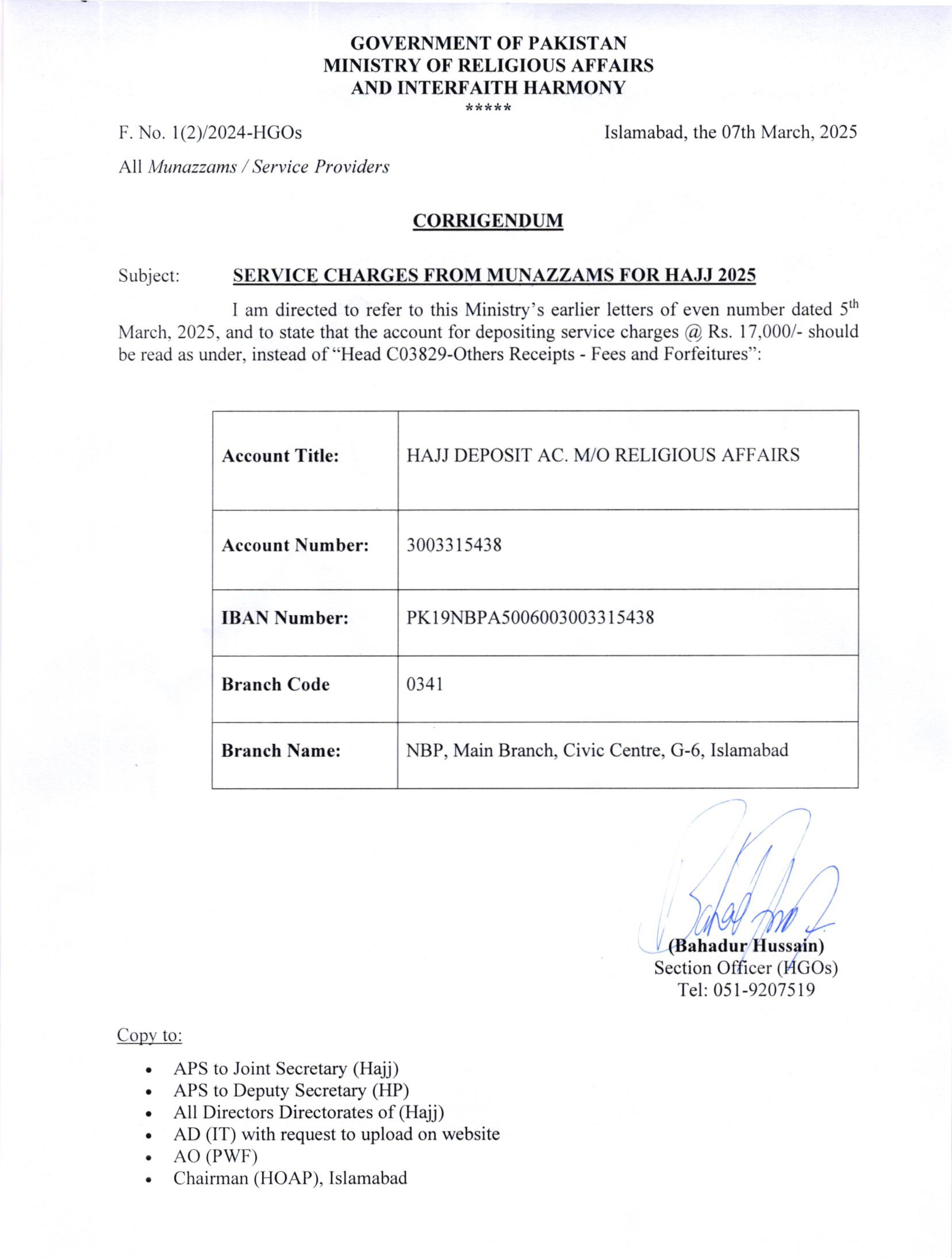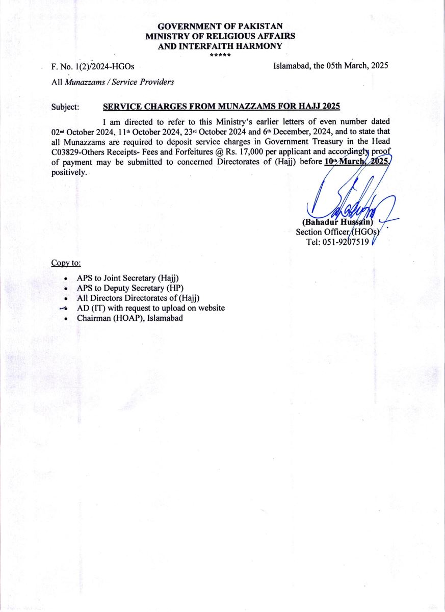 Service charges from Munazzams for Hajj 2025 with Corrigendum Notice