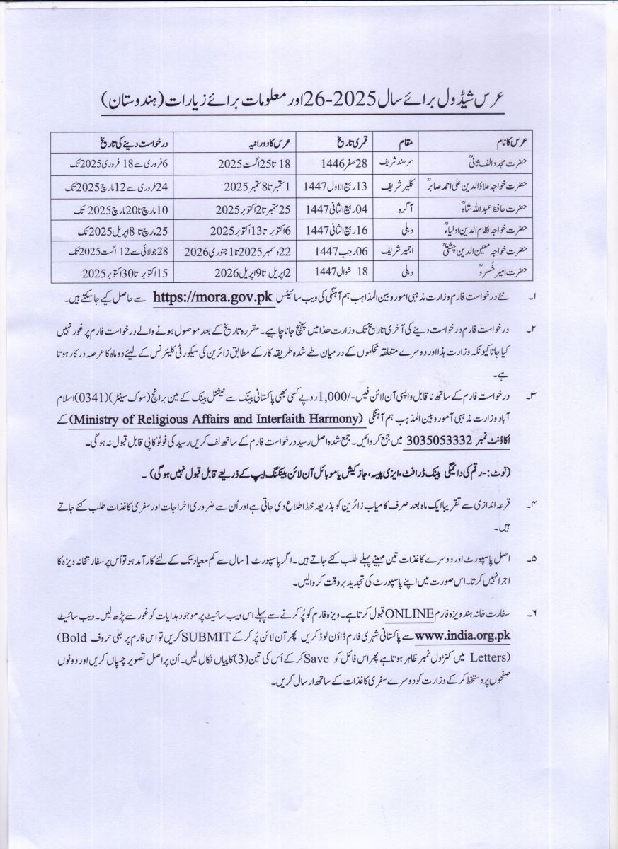 To promote religious tourism and people to people contacts for peace and stability in the region,Government of Pakistan signed a MOU with Government of India on 14th September 1974 regarding ilateral predetermined visits of people of both countries to their religious/ sacred places. Since its signing, the Ministry of Religious Affairs & Interfaith Harmony, Government of Pakistan is regularly arranging visit of Pakistani Zaireen to India on the following Urses: -
